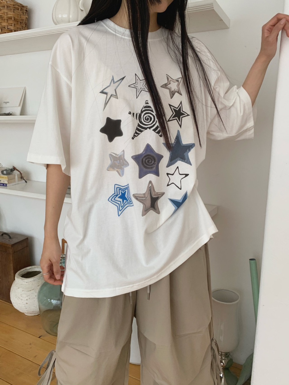 루루 별 스타 프린팅 박시핏 오버핏 루즈핏 빈티지 키치 반팔 티셔츠