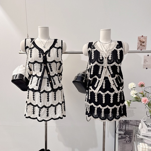 [자켓+스커트set!/페미닌!] 겨울 스카 펀칭 레이스 뜨개 니트 셔링 프릴 배색 우드 버튼 브이넥 조끼 나시 크롭 숏 자켓 밴딩 A라인 플레어 미니 스커트 투피스 세트 [3color]