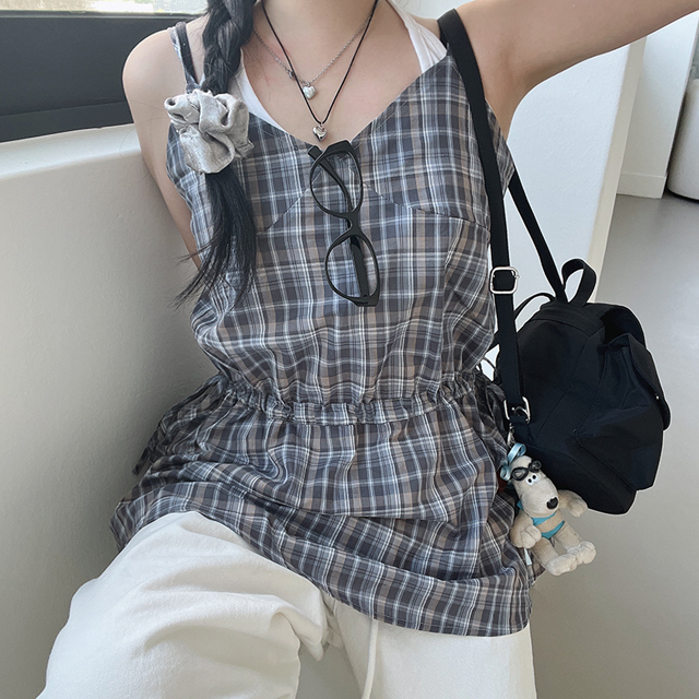 [모리걸코디💕] 체크 레이어드 셔링 빈티지 슬리브리스 여름 나시 뷔스티에 모리걸룩 원피스