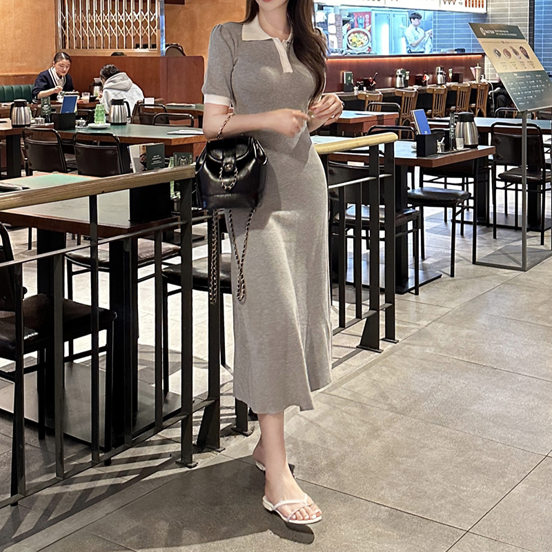 카라 단추 배색 동탄미시룩 머메이드 반팔 롱 원피스