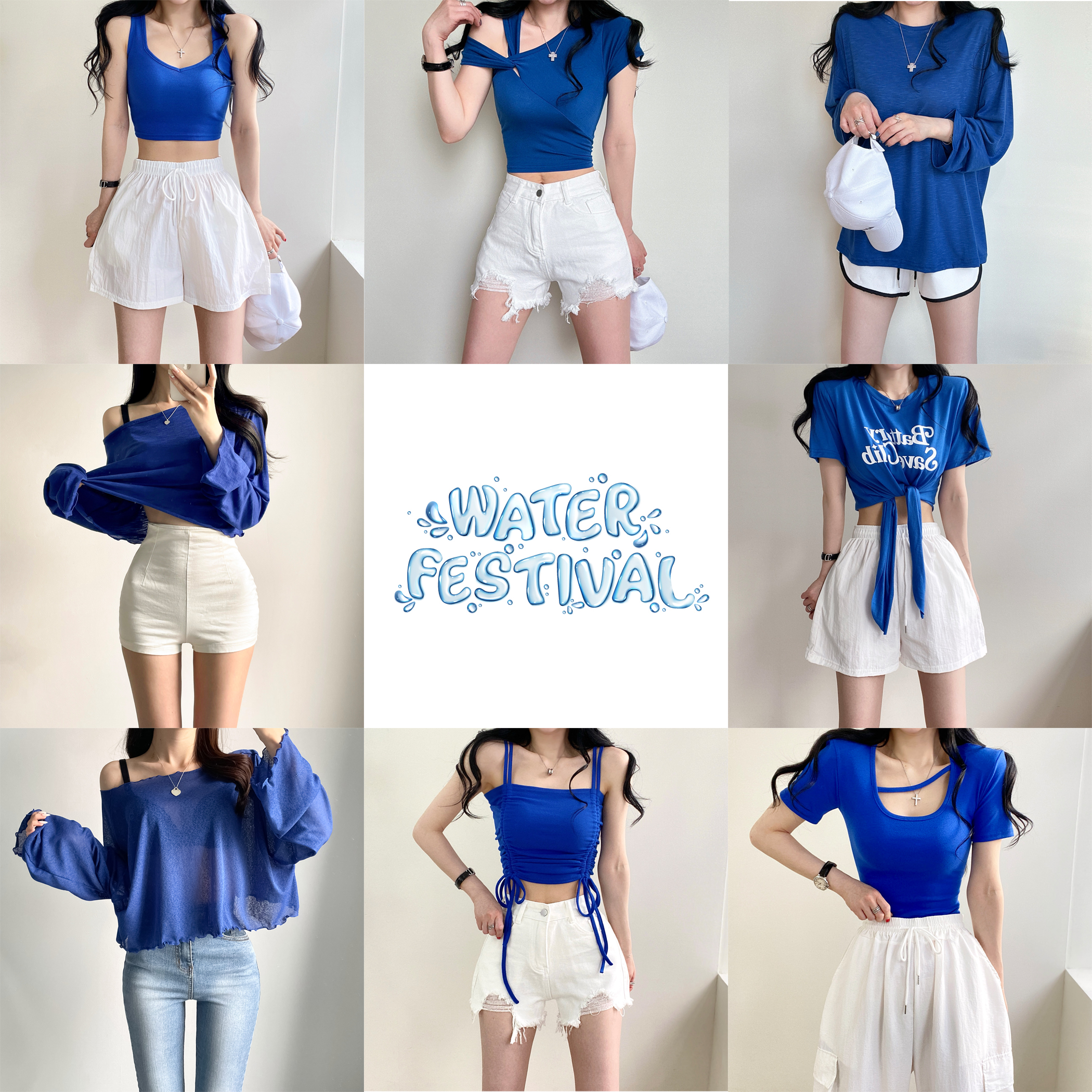 [💫흠뻑쇼코디모음zip/10종💙] 빅사이즈 상의 흠뻑쇼 워터밤 여름 페스티벌 코디 모음 코발트블루 티셔츠 탑 나시 반팔티 크롭 긴팔티셔츠 반팔 파란티 오프숄더 10type