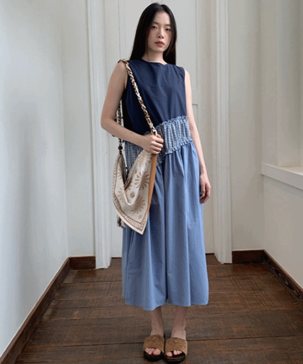 스키치 언발 빈티지 캐주얼 민소매 A라인 썸머 롱원피스 (네이비)