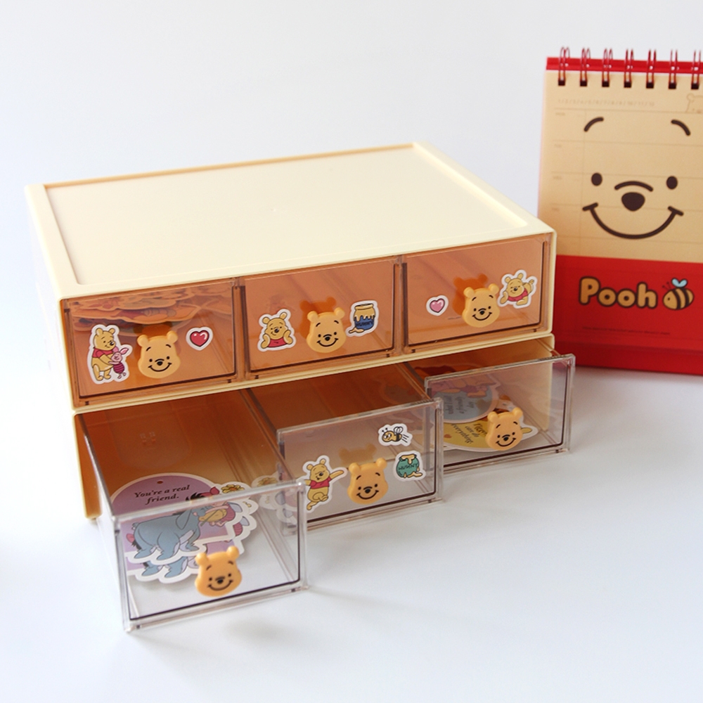 곰돌이푸 미니 3칸 책상 수납 정리 보관 함 서랍 장 & 푸 스티커 [디즈니정품 곰돌이 곰 캐릭터 적층 적제형 플라스틱]