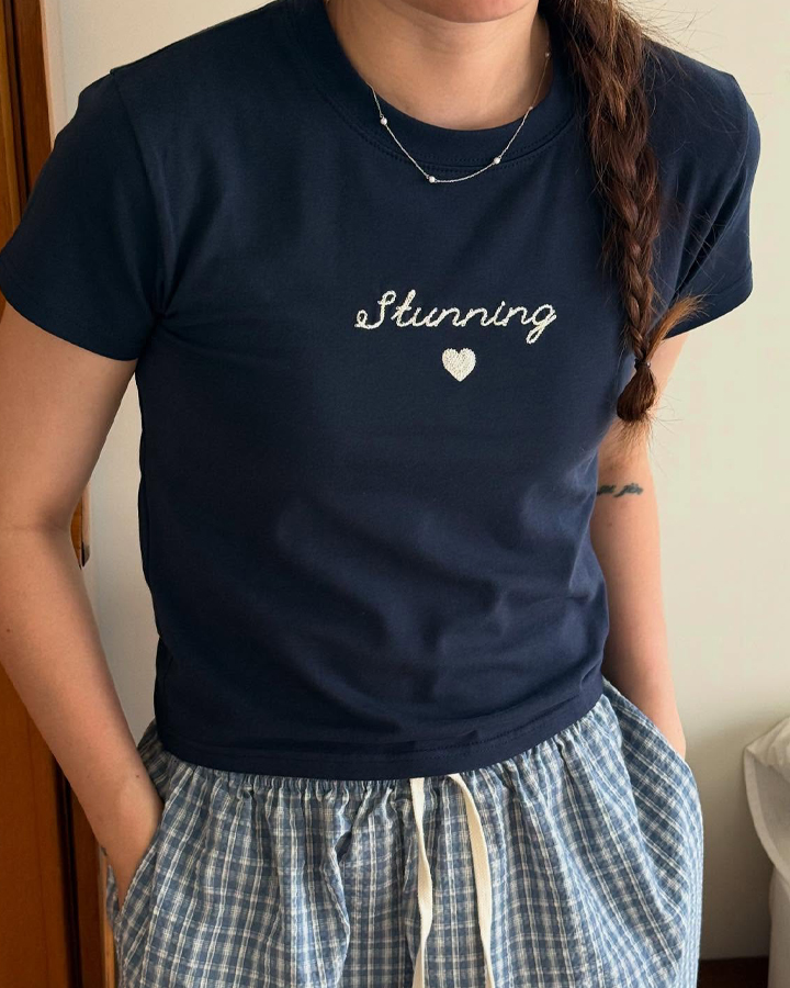 (당일일부)스터닝 자수 마망 스판 티셔츠 여성 슬림핏 하트포인트 캡소매 반팔티 (87525)