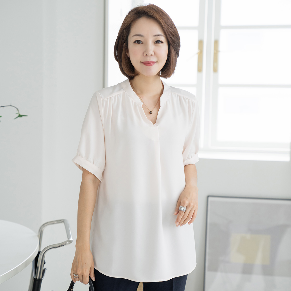 엄마옷 마담4060 모던 심플 브이셔링 반팔 블라우스-QBL2507071-