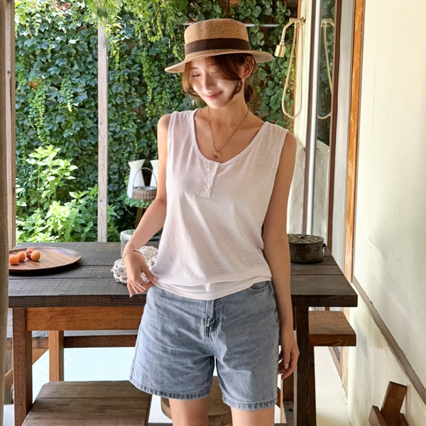 르네어 린넨 나시 헨리넥 단추 슬라브 민소매티