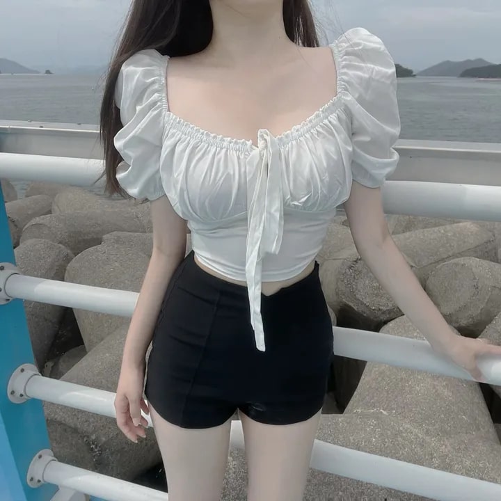 [몸매보정갑/개미허리] 리본 스모크 밴딩 퍼프 셔링 반팔 블라우스 러블리 여친룩 데이트룩