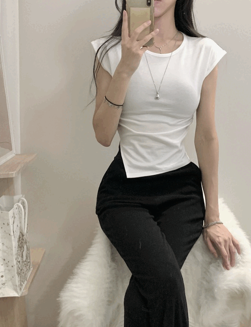 *국내제작 [*잘록허리/모달원단] 이안 옆셔링 사이드트임 밑단사선 캡소매 반팔 티셔츠 -3color